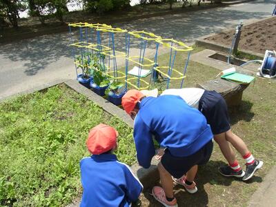 2年生が鉢植えした植物の観察をしていました。
