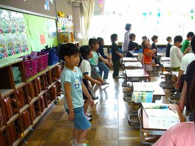 1年生の教室から元気な歌声が聞こえてきました。手拍子をしたり、足踏みをしたりしながら楽しく歌っていました。テキストには「うたいながら行進できたら花丸をつけよう」の文字。みんな花丸ですね!