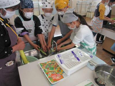 5年生にお調理実習がありました。今日のお題は青菜のおひたし。小松菜を袋から出すところからスタートです。“根もとは、ていねいに流水で洗う”の意味を実践で理解するのも大事なことですね。